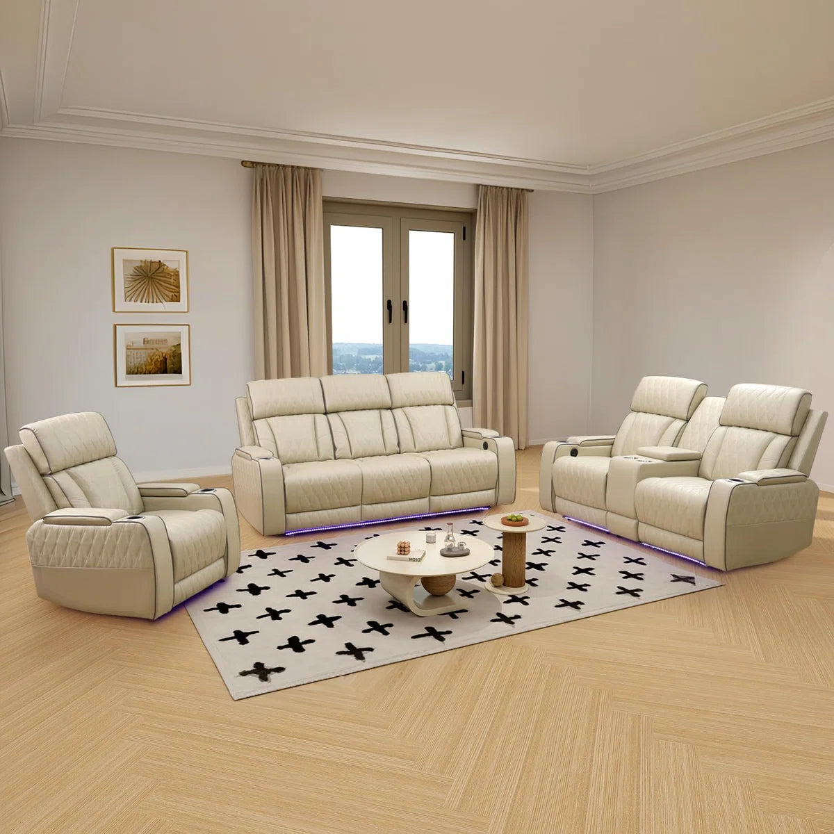 Beige Breathing Leather Power Reclining Living Room Sofa Set 3 Pieces