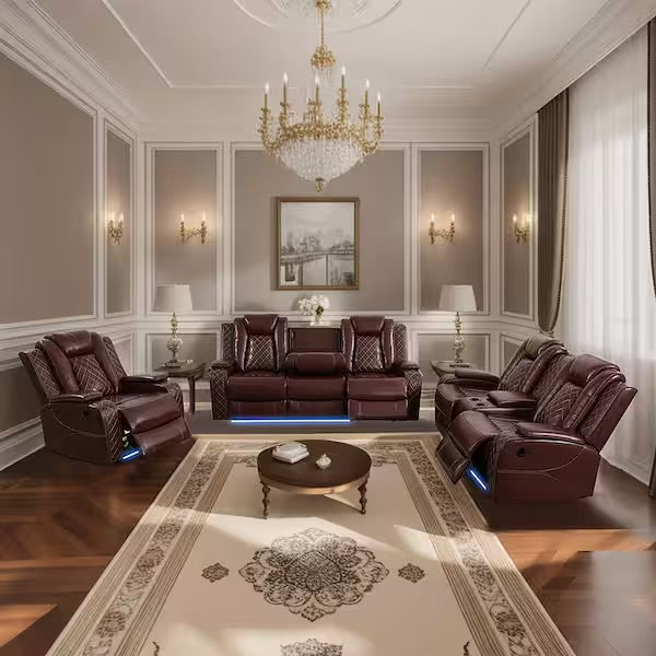 Power reclining couch set, USB port, wireless charger, storage space, and LED lights.
