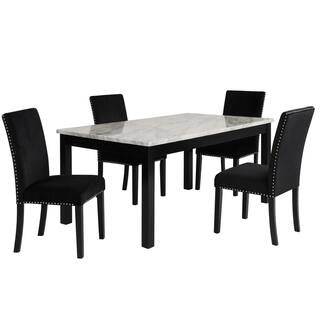 Simple, sleek, and elegant style with a Faux Marble Top Table finished in a rich, dark espresso. Chair upholstered on velvet Fabric, accented by studded chrome nailheads. Thickly padded cushions provide a comfortable place to sit while solid wood legs finished in a handsome espresso hue complete the look.