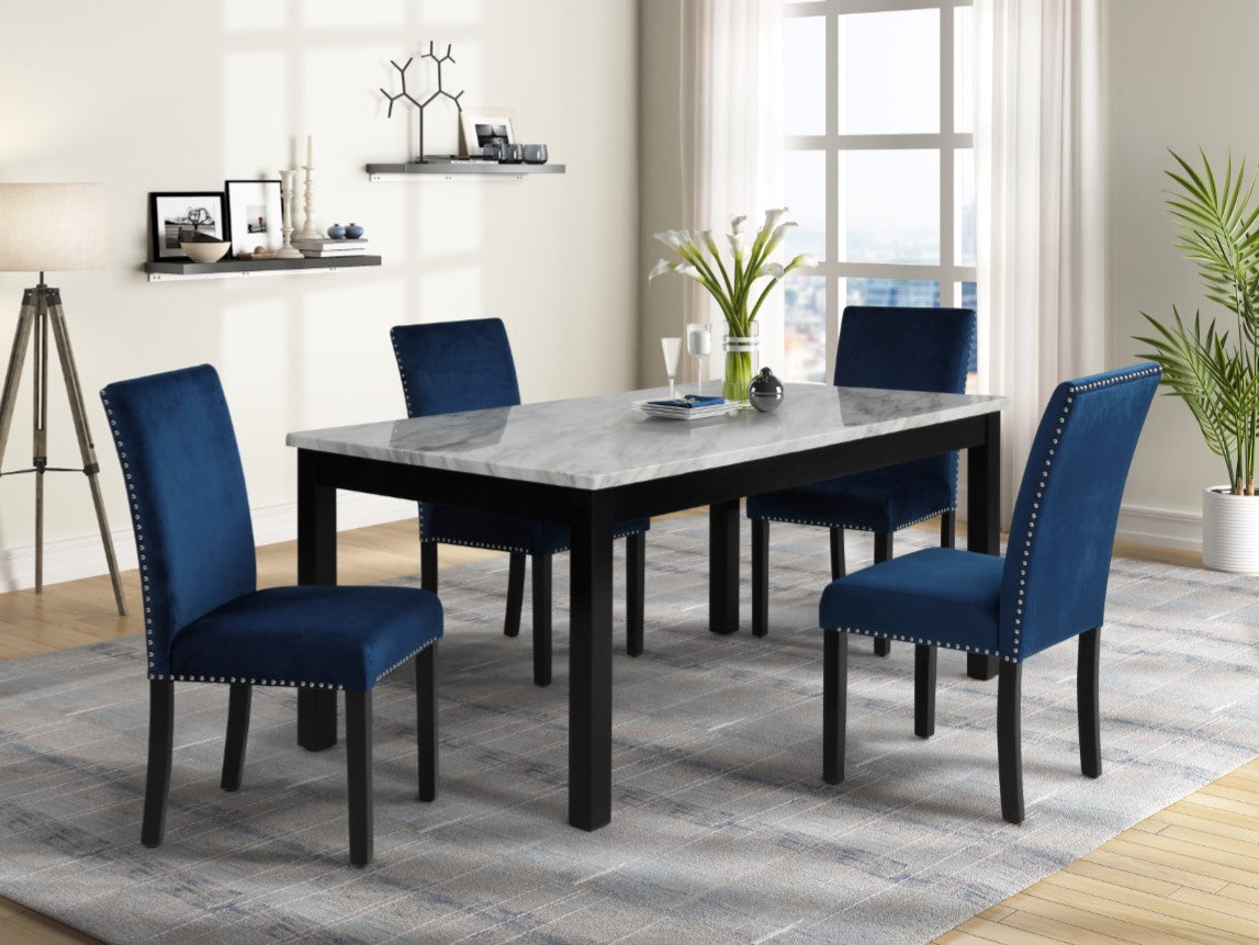 Simple, sleek, and elegant style with a Faux Marble Top Table finished in a rich, dark espresso. Chair upholstered on velvet Fabric, accented by studded chrome nailheads. Thickly padded cushions provide a comfortable place to sit while solid wood legs finished in a handsome espresso hue complete the look.